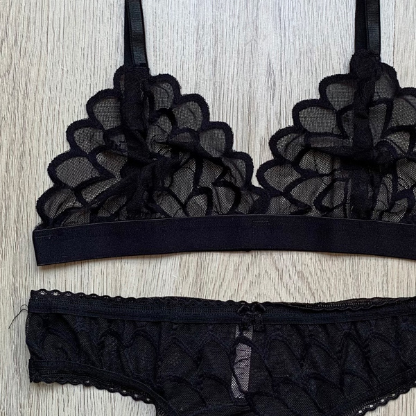 Conjunto sensual, cómodo y hermoso para el día a día, el top en triangulo tiene transparencias que lo hacen único. Con un su encaje color negro, las tiras del top las puedes ajustar a tu medida.