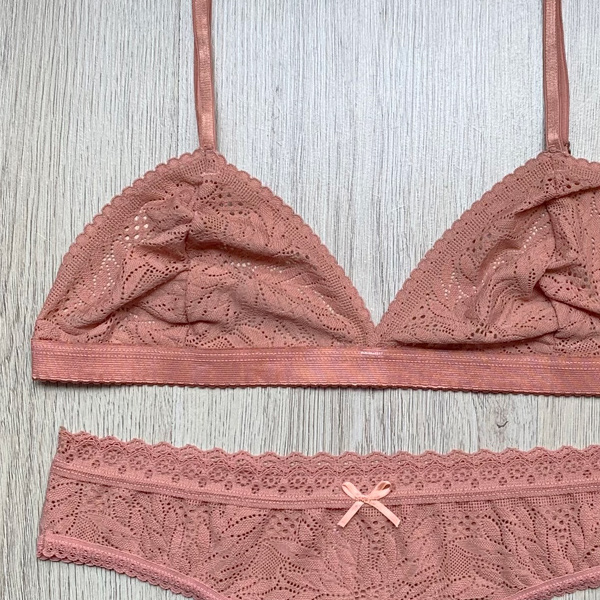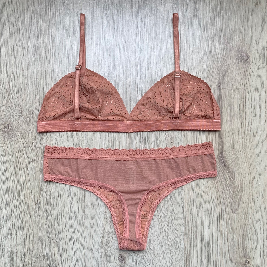 Conjunto muy sensual, cómodo y hermoso para el día a día, el top en triangulo tiene transparencias que lo hacen único. Con un su encaje color pude, las tiras del top las puedes ajustar a tu medida.