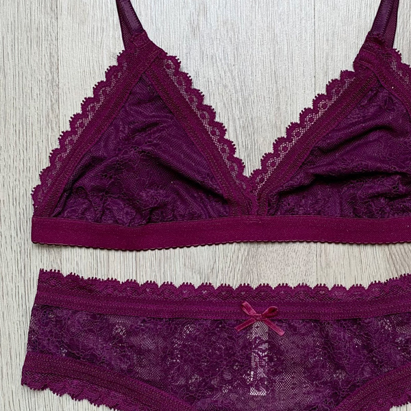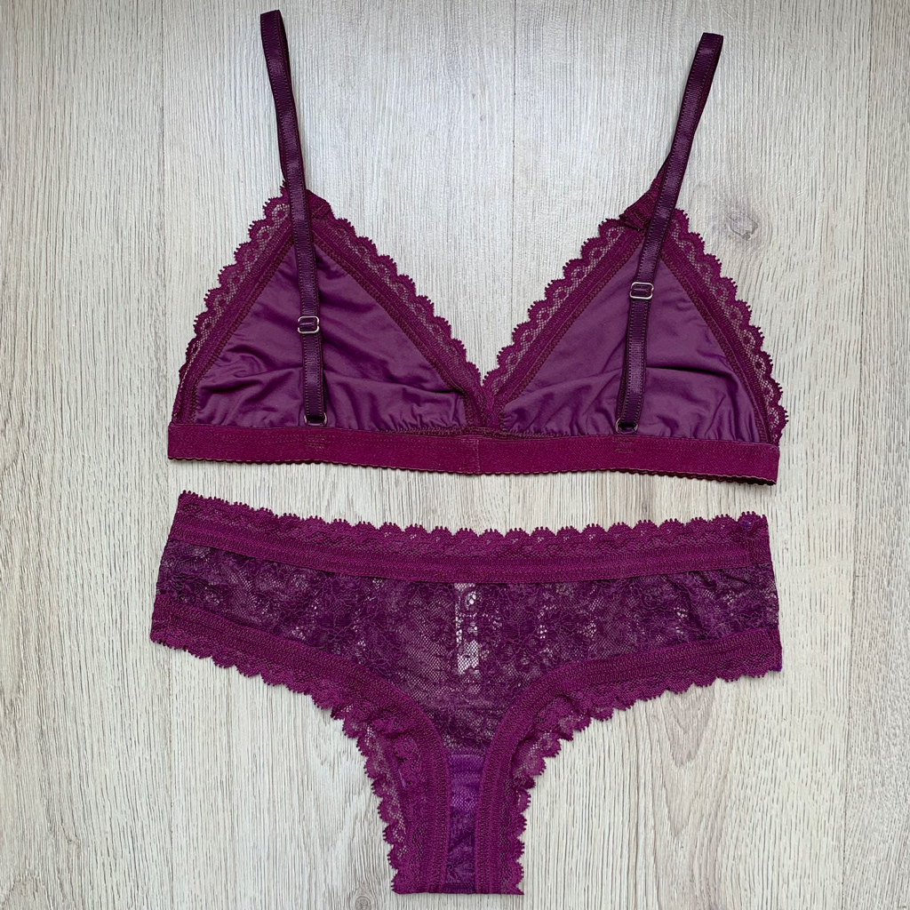 Conjunto en color uva hermoso, sutil encaje en pequeñas flores. protector en el top para tu mayor comodidad y en su panty el protector es 100% algodón.
