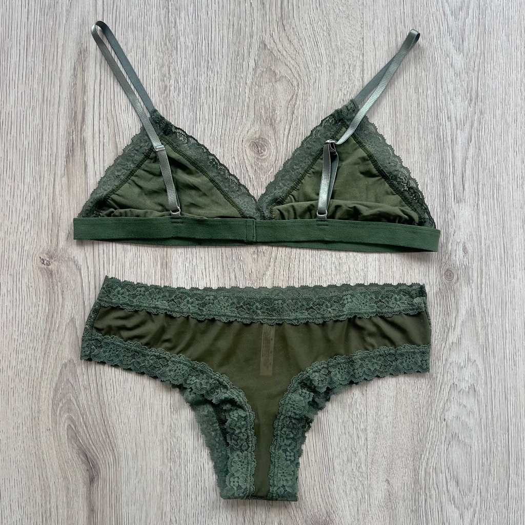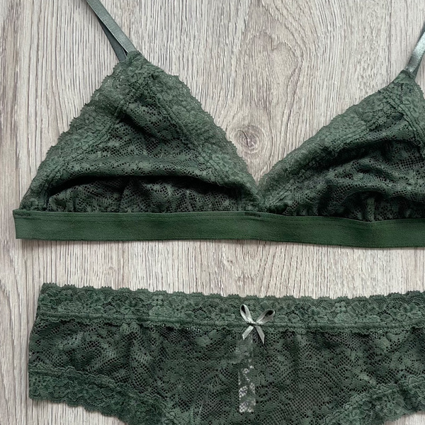 Hermoso conjunto con panty y top, encaje color verde militar, su top tiene protector para tu mayor comodidad.